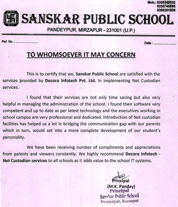 This is to certify that we, Sanskaar Public School are satisfied with the services